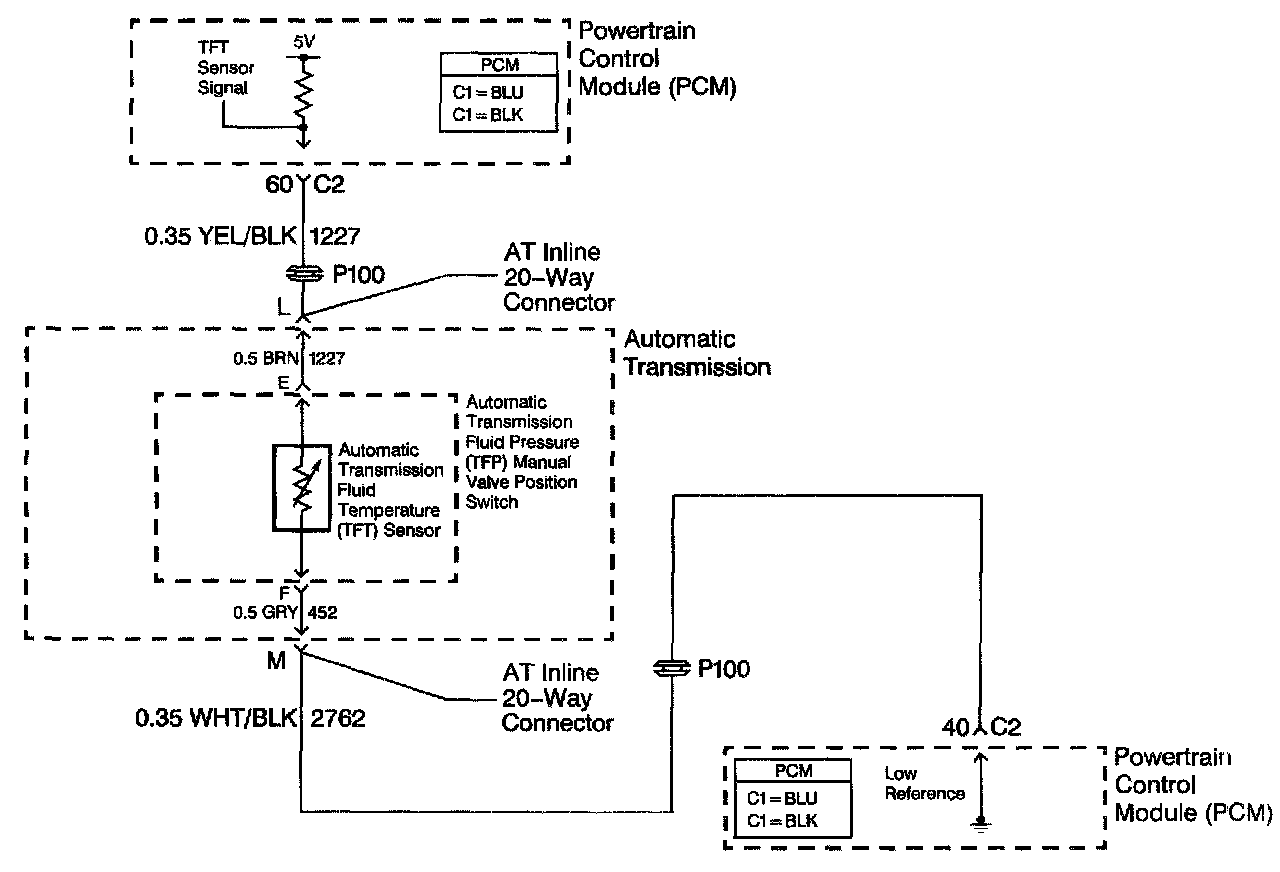 The automatic Transmission Fluid Temperature (TFT) sensor is a thermistor. The TFT sensor is part of the automatic Transmission Fluid Pressure (TFP) manual valve position switch. The PCM supplies a 5 volt reference signal to the sensor. When the transmission fluid is cold, the sensor resistance is high and the PCM senses a high signal voltage. As the transmission fluid warms, the sensor resistance lowers and the PCM senses lower voltage. The PCM uses the TFT reading in order to control the Torque Converter Clutch (TCC), line pressure adjustments, and temperature compensated shifts.