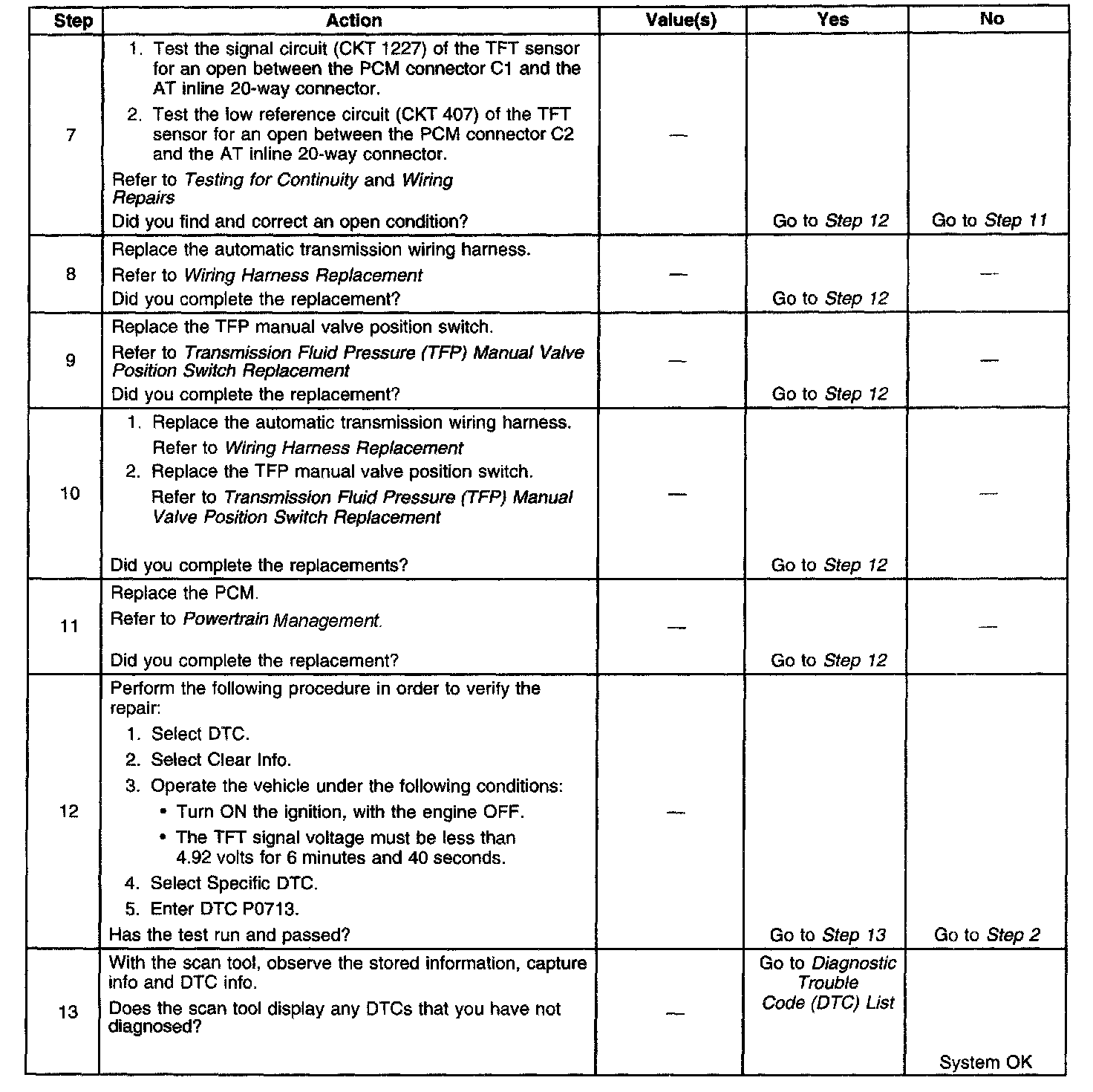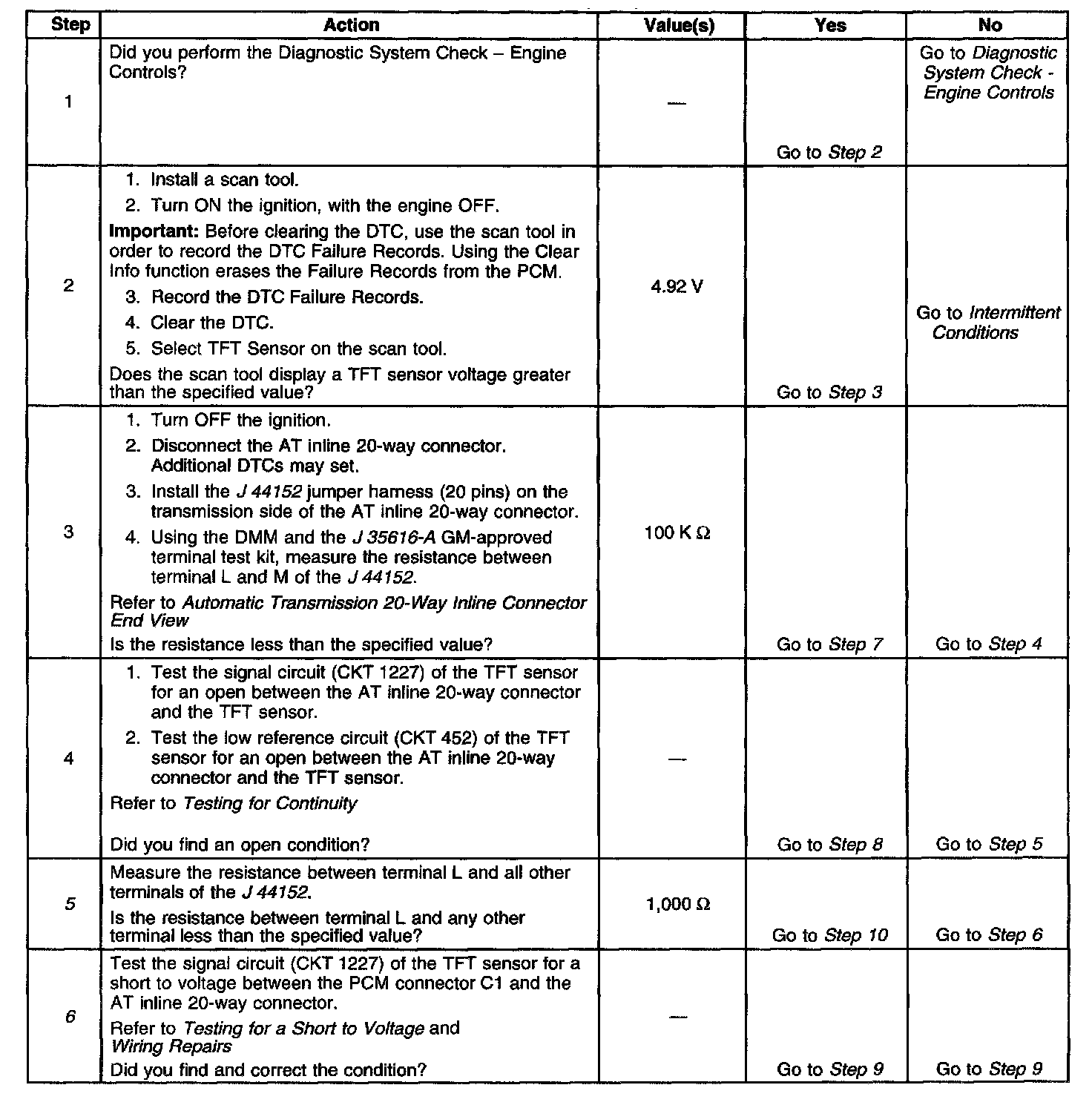 5. This step tests the TFT sensor signal circuit for being shorted to another circuit within the transmission. If the TFT sensor signal circuit shorts to another circuit, which is carrying voltage greater than five volts, the TFT sensor would become open.