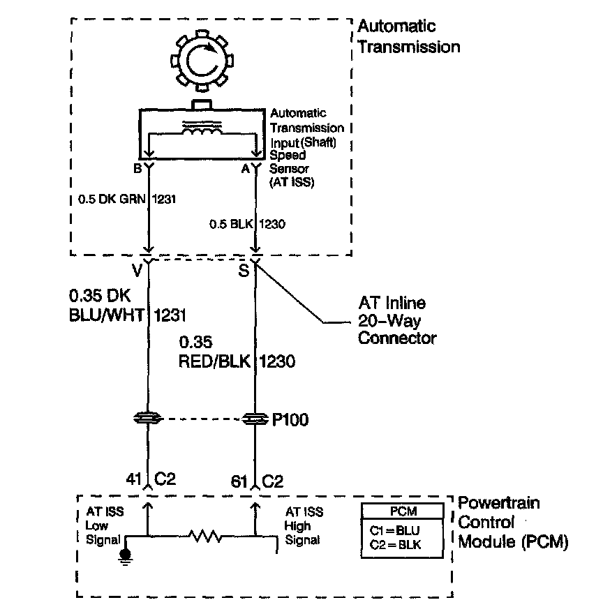 The Automatic Transmission Input Shaft Speed Sensor (AT ISS) provides transmission input speed to the PCM. The AT ISS is a permanent magnet generator. The sensor mounts into the transmission case and maintains a slight air gap between the sensor and the drive sprocket. The AT ISS produces an AC voltage as the drive sprocket rotor teeth pass through the magnetic field of the sensor. The AC voltage level increases as the turbine shaft speed increases. The PCM converts the AC voltage into a digital signal. The PCM determines actual turbine speed using the digital signal. The PCM uses the input speed to calculate torque converter slip speed, and gear ratios.