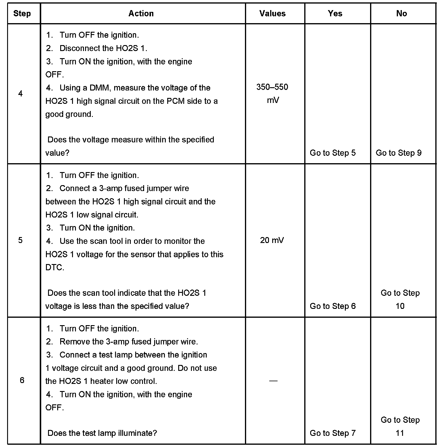 2. When the system is operating correctly, the HO2S 1 voltage should toggle above and below the specified values. You may need to operate the vehicle within the Freeze Frame conditions and Conditions for Setting the DTC in order to duplicate the malfunction that was detected by the PCM.