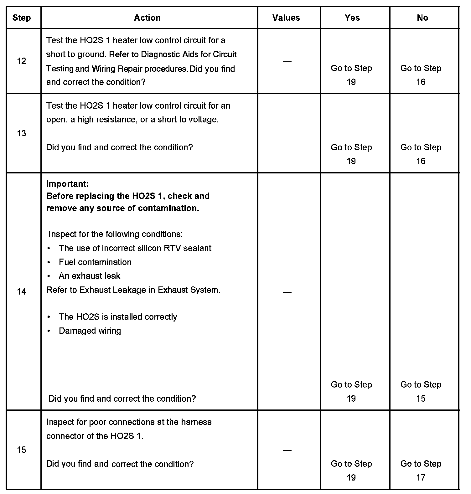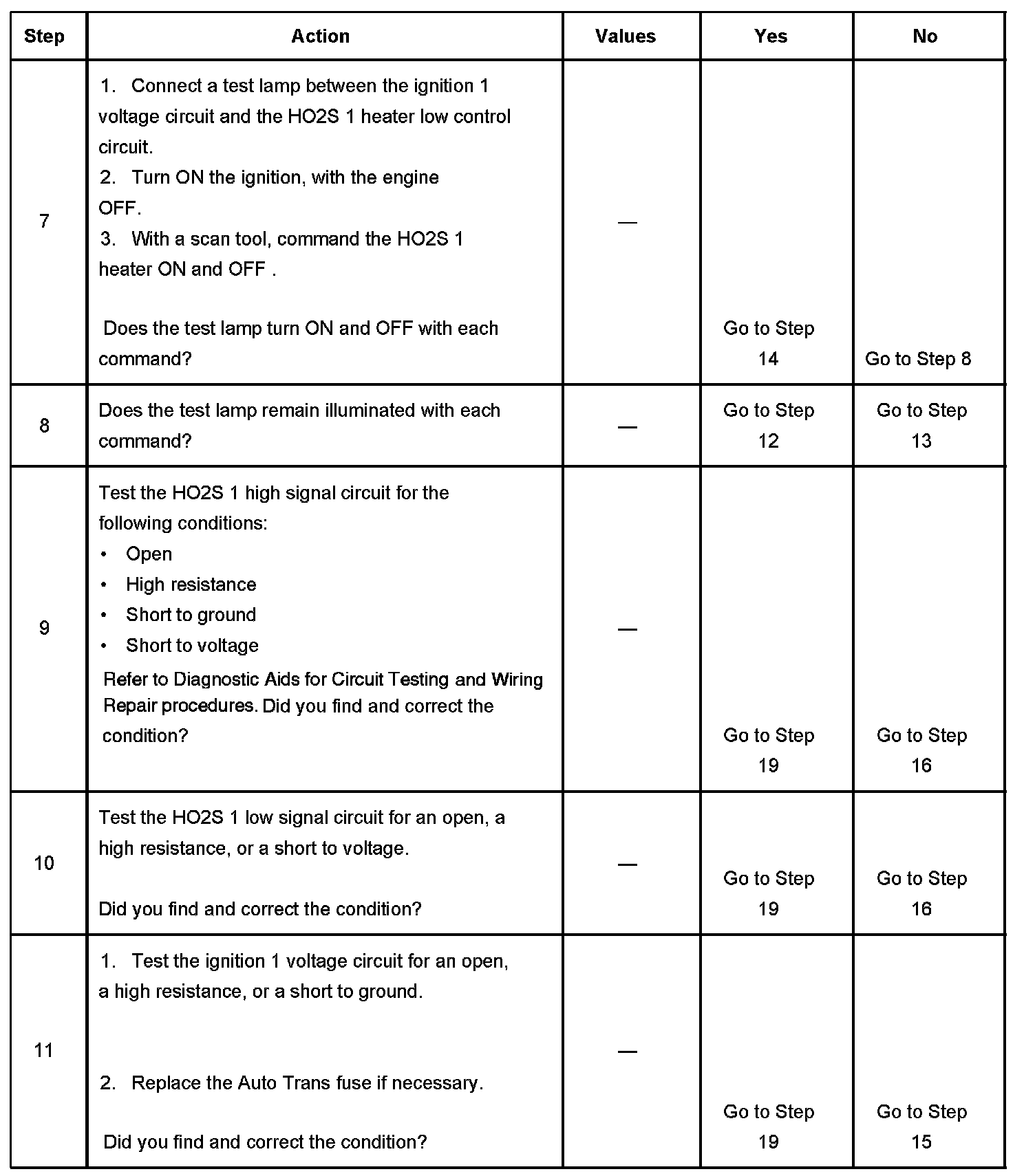 The numbers below refer to the step numbers on the diagnostic table.
