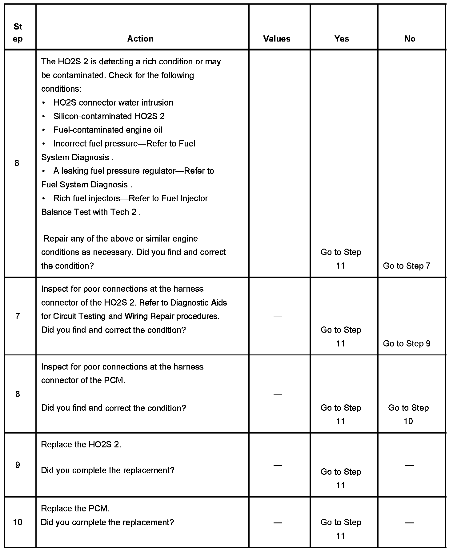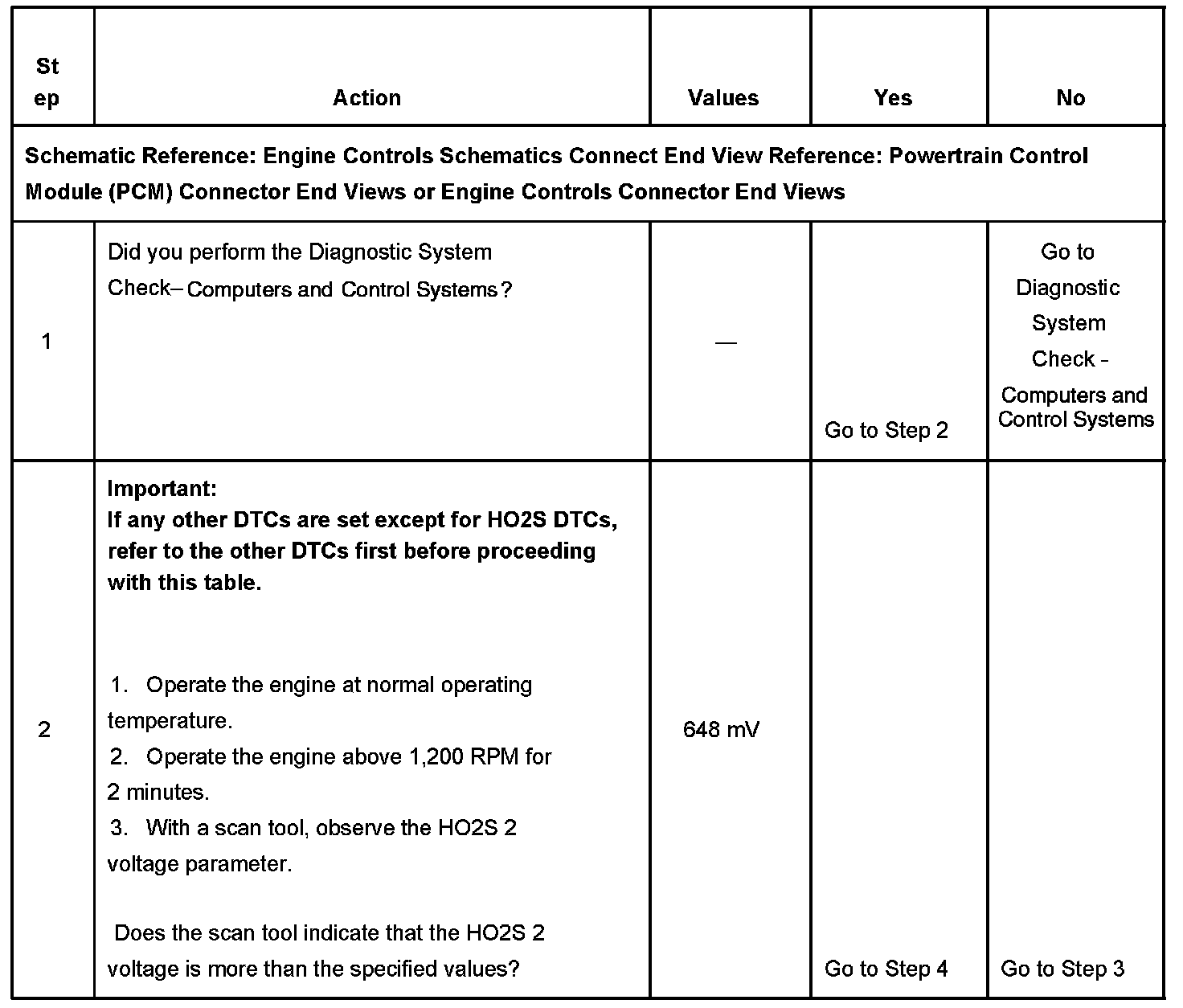 6. Disconnecting the HO2S 2 and connecting a jumper wire between the HO2S 2 high signal circuit and the HO2S 2 low signal circuit to ground, should cause the scan tool to display HO2S 2 voltage below 100 mV. If the signal voltage is still high, the this indicates that the PCM is malfunctioning.