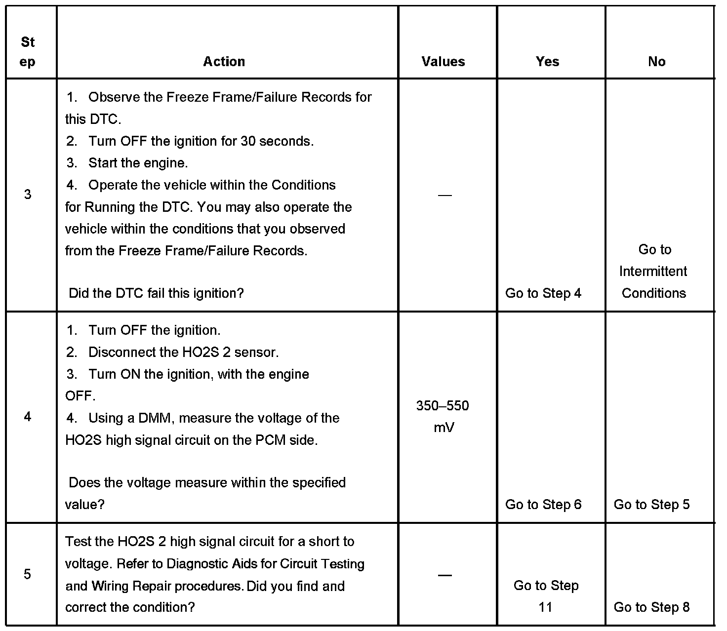 2. When the system is operating correctly, the HO2S 2 voltage should toggle above and below the specified values. You may need to operate the vehicle within the Freeze Frame conditions and Conditions for Setting the DTC in order to duplicate the malfunction that was detected by the PCM.
