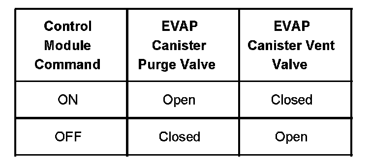 The table illustrates the relationship between the ON and OFF states, and the Open or Closed states of the EVAP canister purge and vent valves.
