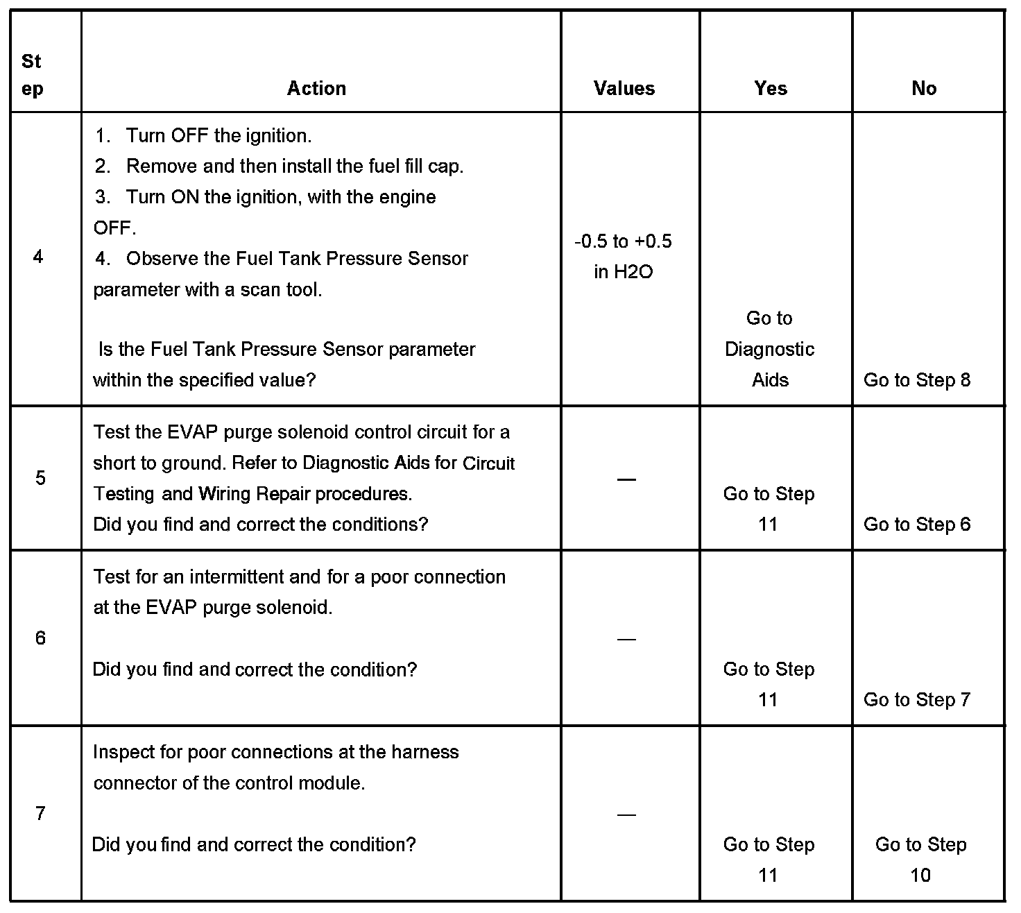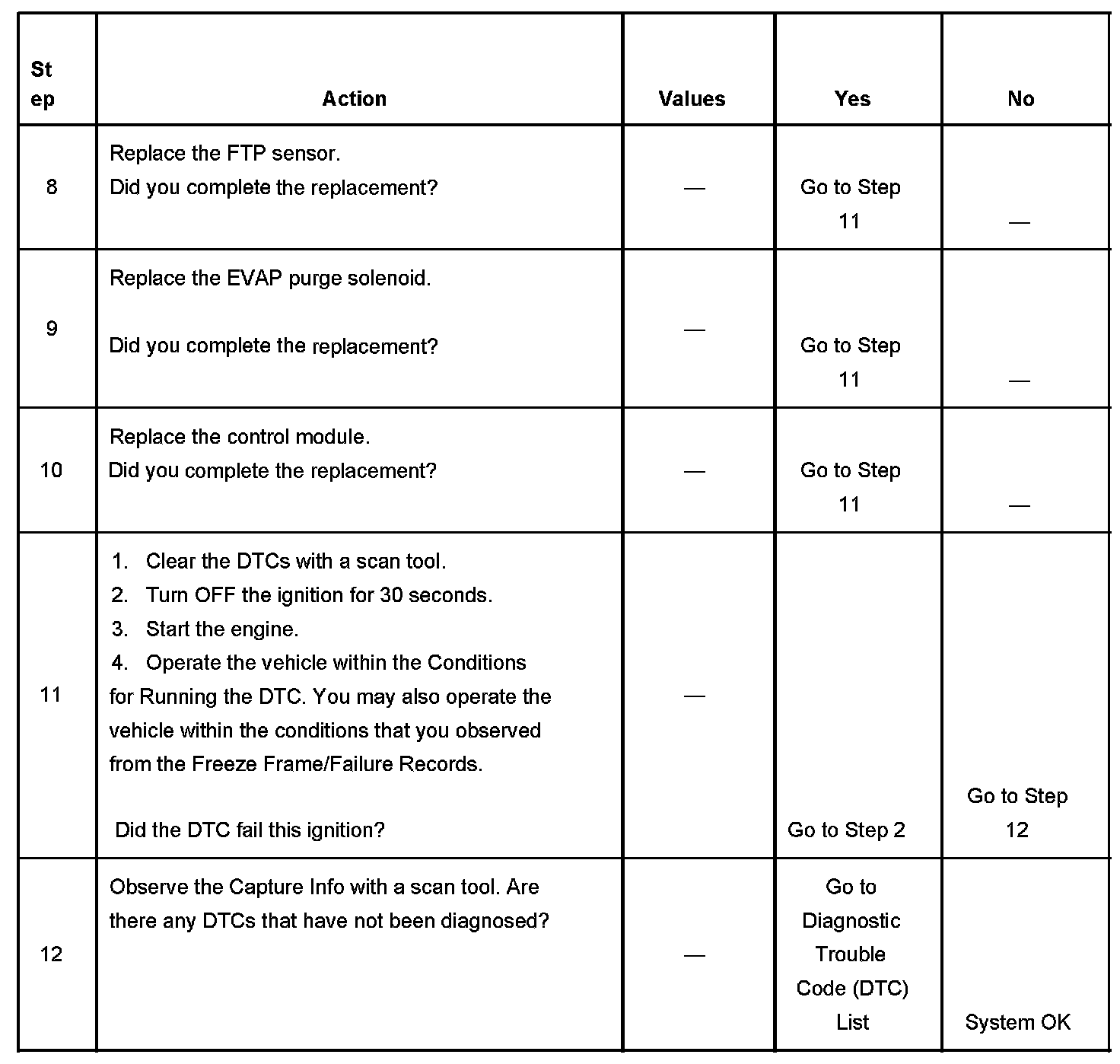 SYSTEM DESCRIPTIONThis DTC tests for undesired intake manifold vacuum flow to the evaporative emission (EVAP) system. The control module seals the EVAP system by commanding the EVAP canister purge valve Closed and the EVAP canister vent valve Closed. The control module monitors the fuel tank pressure (FTP) sensor to determine if a vacuum is being drawn on the EVAP system. If vacuum in the EVAP system is more than a predetermined value within a predetermined time, this DTC sets.