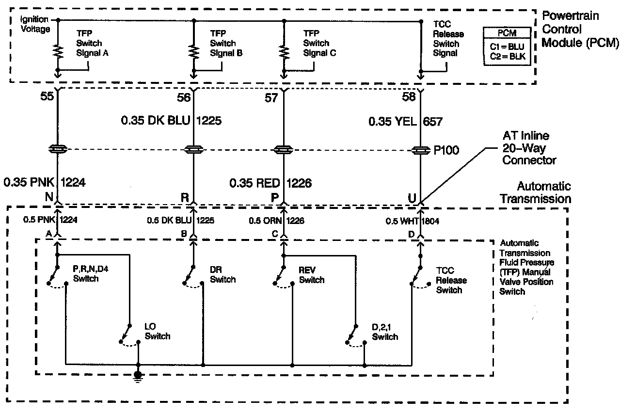 The automatic Transmission Fluid Pressure (TFP) manual valve position switch consists of six pressure switches. Five of the switches are normally-open, and determine gear range selection. The sixth switch is normally-closed, and detects Torque Converter Clutch (TCC) release fluid pressure. The TFP manual valve position switch also contains the automatic Transmission Fluid Temperature (TFT) sensor. These components are combined into one unit, attached to the control valve body.