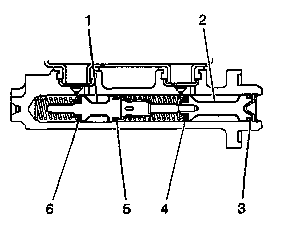 8. If the brake pedal apply did not feel spongy, and the brake pedal travel was initially steady and not excessive, but then gradually fell, then the master cylinder requires overhaul or replacement due to an internal leak past the secondary piston (1) from the secondary piston primary seal (6) or secondary seal (5).