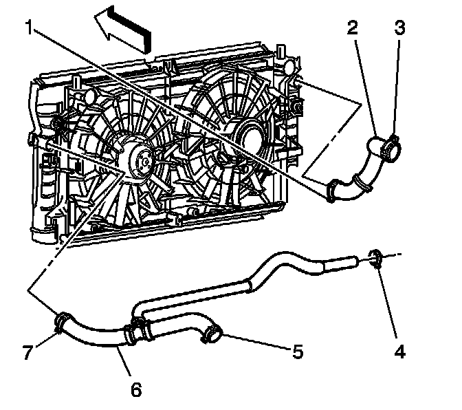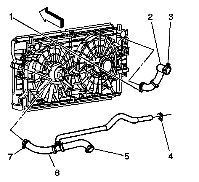 18. Use the J 38185 in order to reposition the surge tank outlet/radiator outlet hose clamp (7) from the radiator.