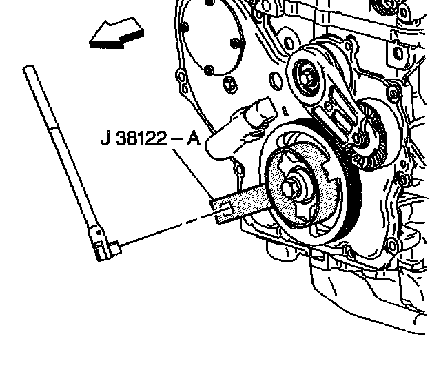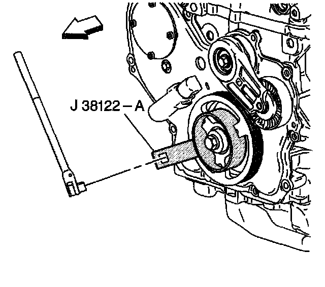 5. Use J 38122-A to prevent the crankshaft from rotating while loosening the crankshaft balancer bolt.