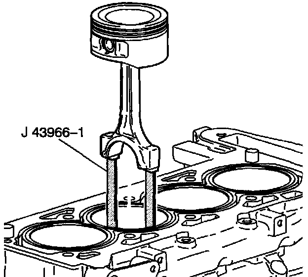 6. Install J-43966-1 on the connecting rod bolts before removing the piston and connecting rod assembly.