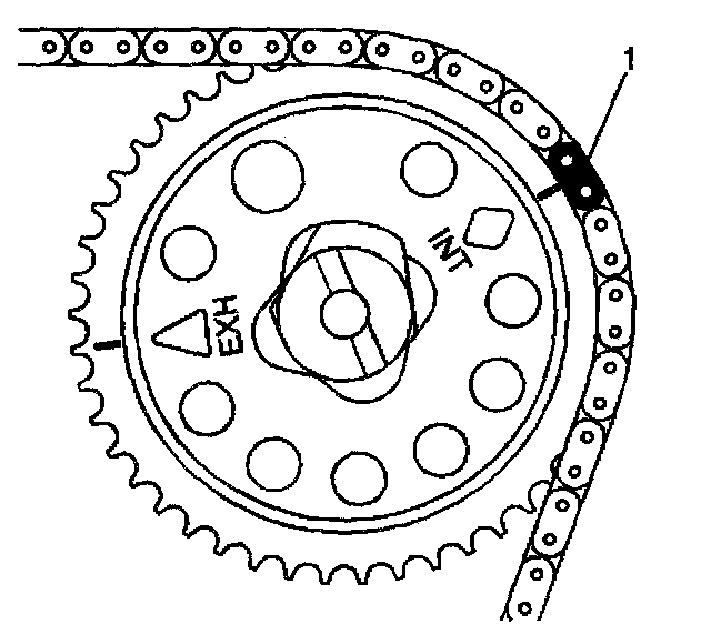2. Assemble the intake camshaft sprocket to the timing chain with the timing mark lined up with the copper colored link (1). Hand tighten a new intake camshaft sprocket bolt.