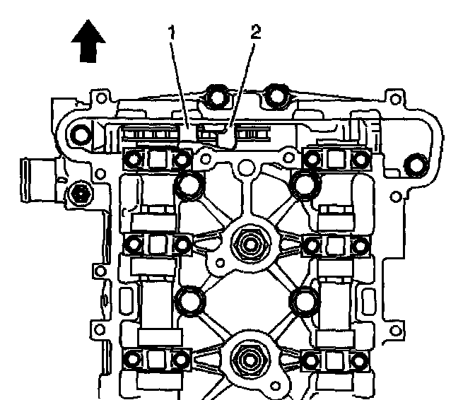3. Lower the timing chain through the opening in the cylinder head. Use care to ensure that the chain goes around both sides of the cylinder block bosses (1,2).