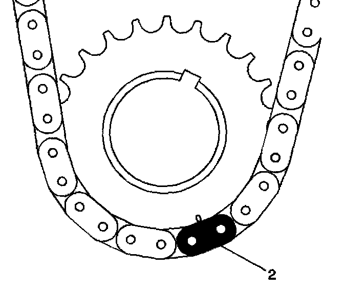4. Route the timing chain around the crankshaft sprocket and line up the second silver link (2) with the timing mark on the crankshaft sprocket, in approximately the 5 o'clock position.