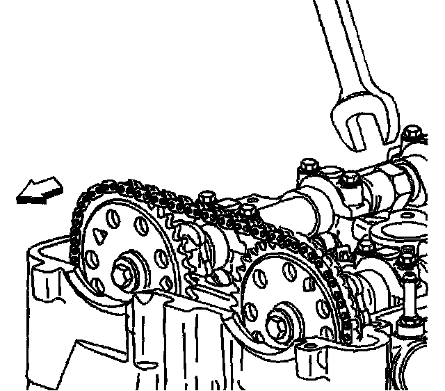 8. Using a 24 mm wrench, first turn the intake camshaft until the alignment feature on the back of the camshaft sprocket seats in the notch in the front of the intake camshaft.