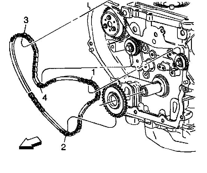 A. Orient the chain so that the copper colored and chrome colored links are visable. Place the copper colored link (1) so that it lines up with the timing mark on the intake side balance shaft sprocket.