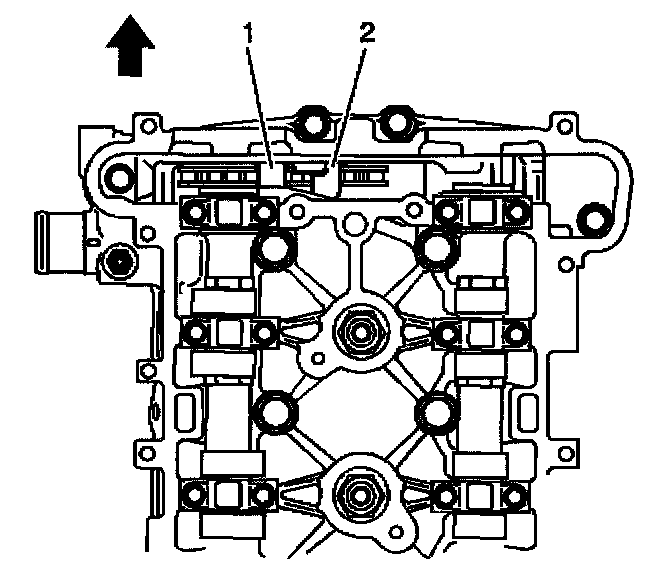 12. Lower the timing chain through the opening in the top of the cylinder head. Carefully ensure that the chain goes around both sides of the cylinder block bosses (1, 2).