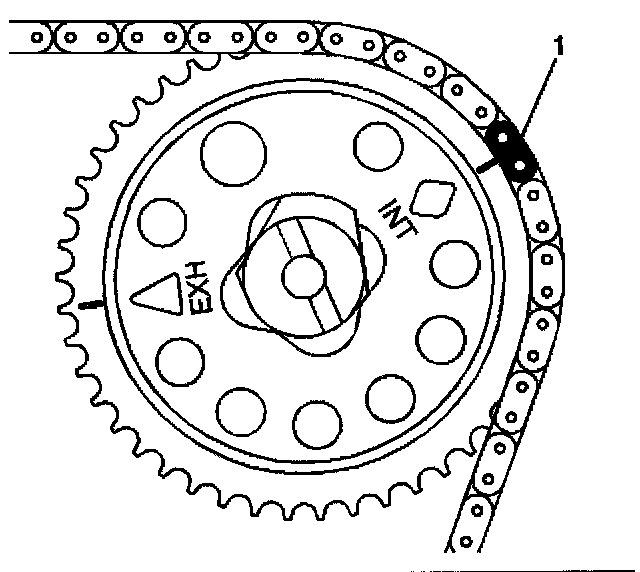 16. Route the timing chain around the intake camshaft sprocket with the uniquely colored link (1) aligning with the INT diamond.