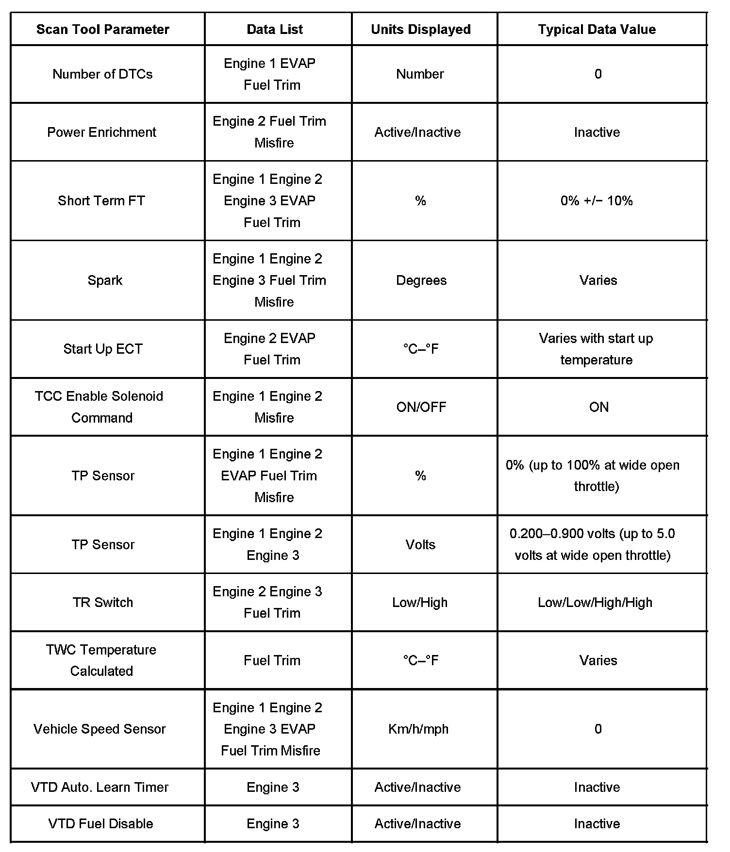 The Engine Scan Tool Data List contains all engine related parameters that are available on the scan tool. The list is arranged in alphabetical order. The parameters in the Typical Scan Data values column represent values that would be seen on a normally running engine.