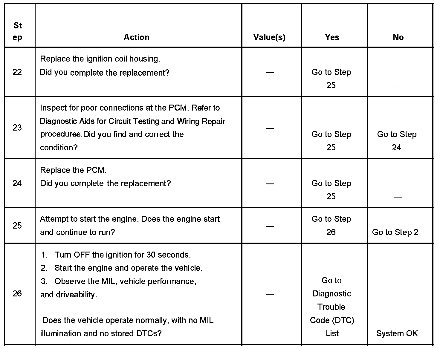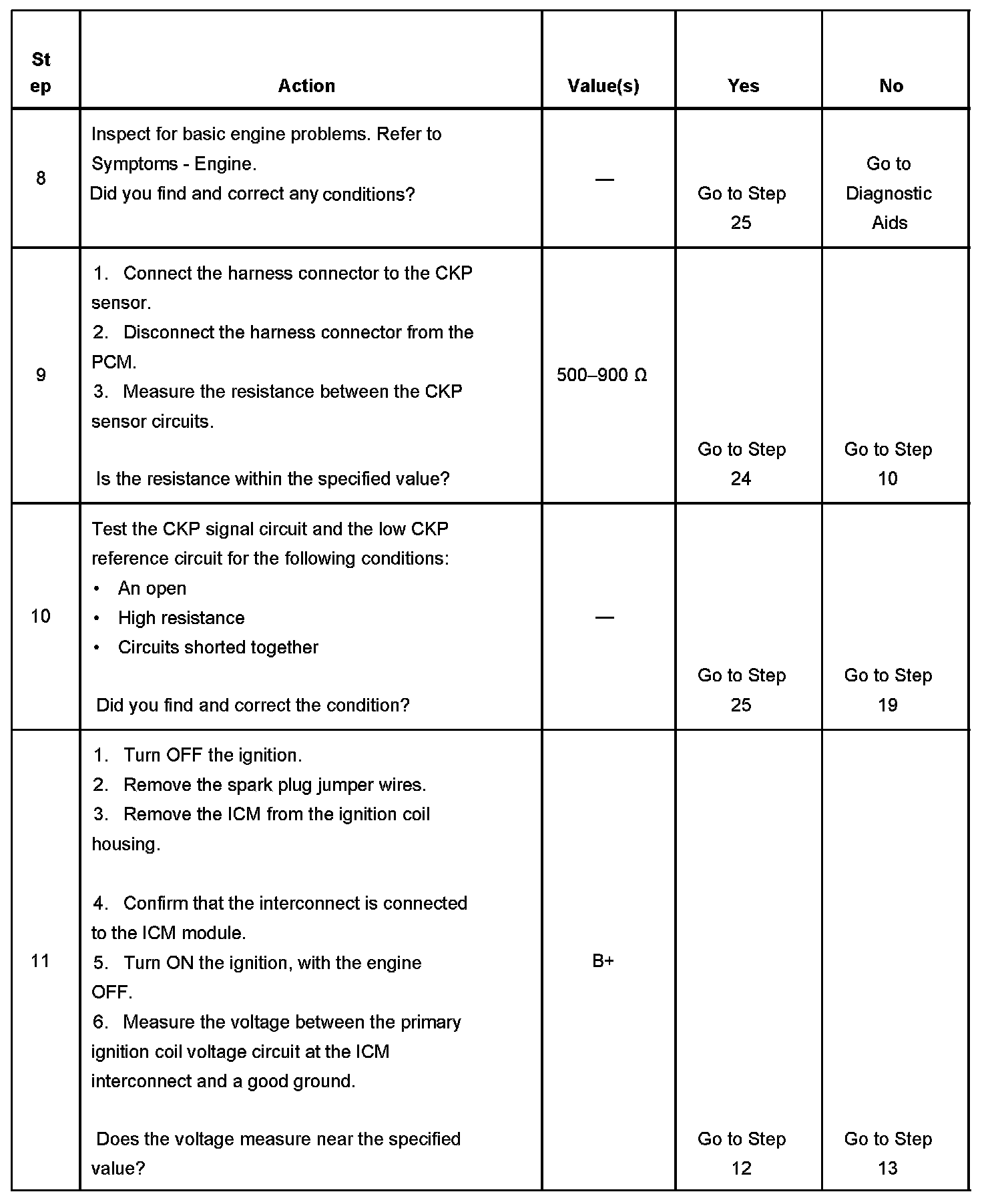 The numbers below refer to the step numbers on the diagnostic table.