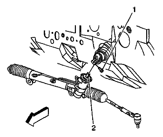 5. Remove the intermediate shaft lower pinch bolt (1) from the power steering gear (2).