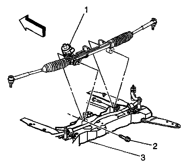 8. Remove the power steering gear bolts (2) from the frame (3).