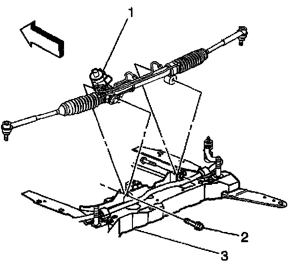 2. Install the power steering gear mounting bolts (2) to the frame (3).