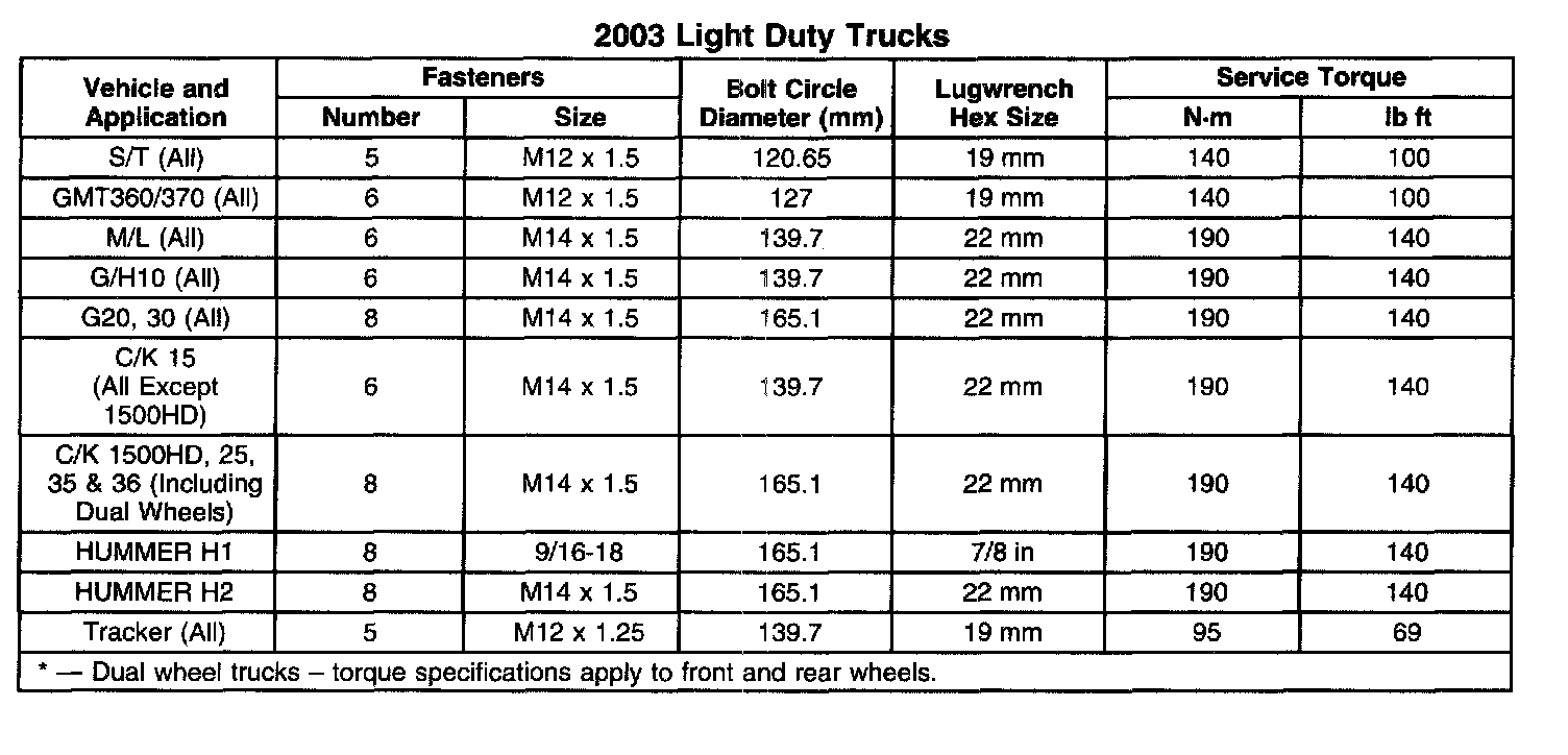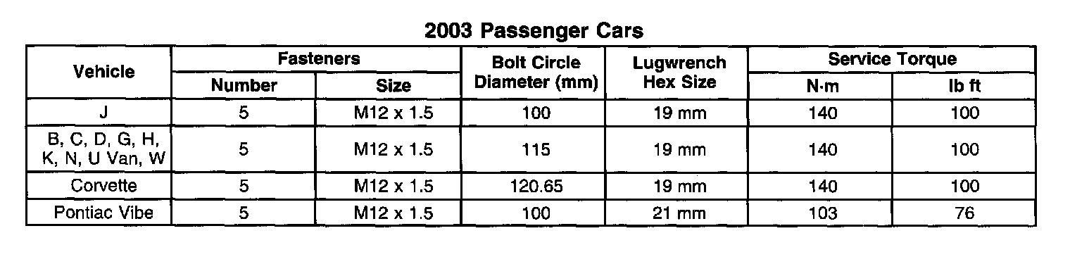 This bulletin is being issued to list the recommended wheel nut/bolt torque specifications for passenger cars and light duty trucks for the 2003 model year.
