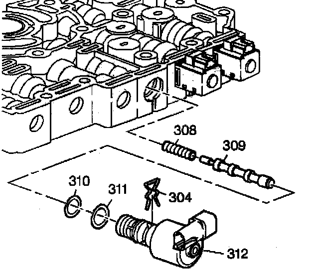 2. Remove the Pressure Control Solenoid (PCS) retainer clip (304), the PCS with two O-rings and screen (312, 309, 310), the torque signal regulator valve (309), and the torque signal regulator spring (308).