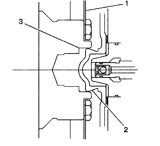 3. Align the torque converter hub (2) in the engine crankshaft (3) and install the torque converter to flywheel bolts.