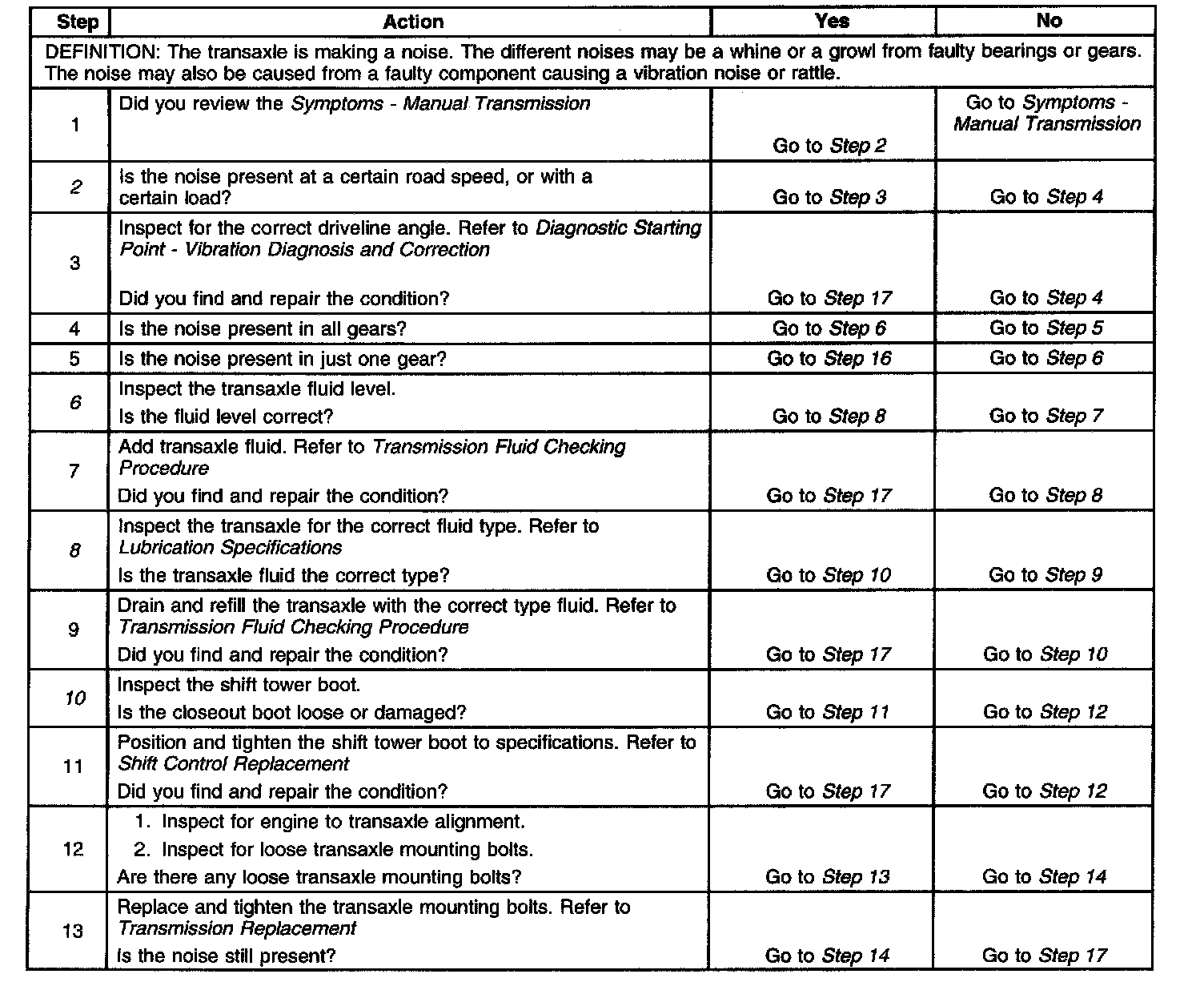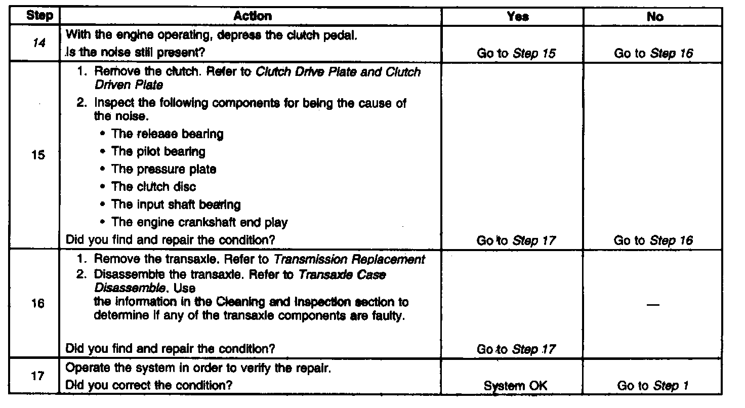 14. This step tests to determine if clutch components are making the noise. Depress the clutch pedal slowly and listen for the change in noise. If the noise changes while pressing the pedal, it may be a faulty clutch component. If the noise does not change until the clutch is completely disengaged, the transaxle component is faulty.