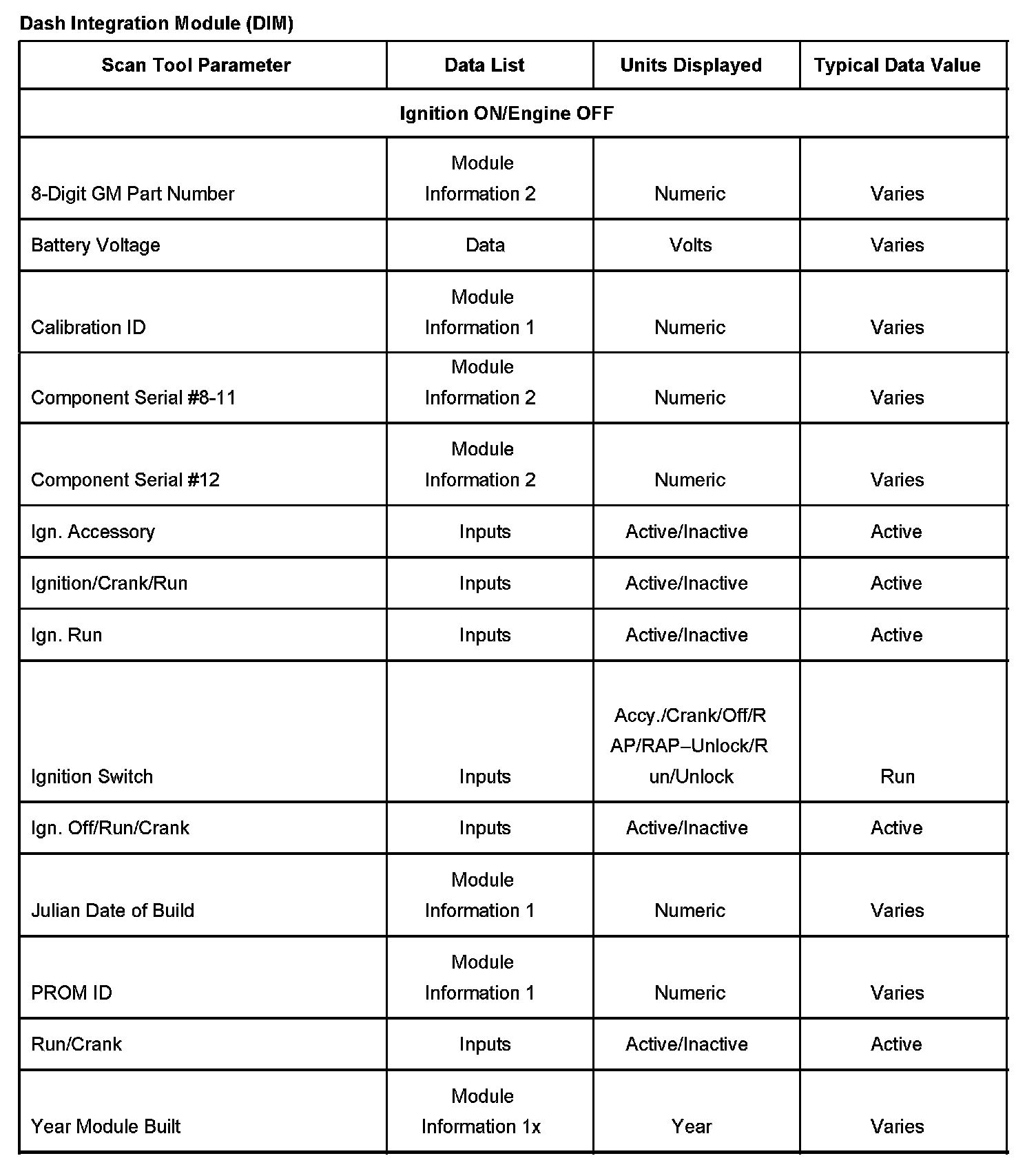 Scan Tool Data List - Dash Integration Module (DIM)