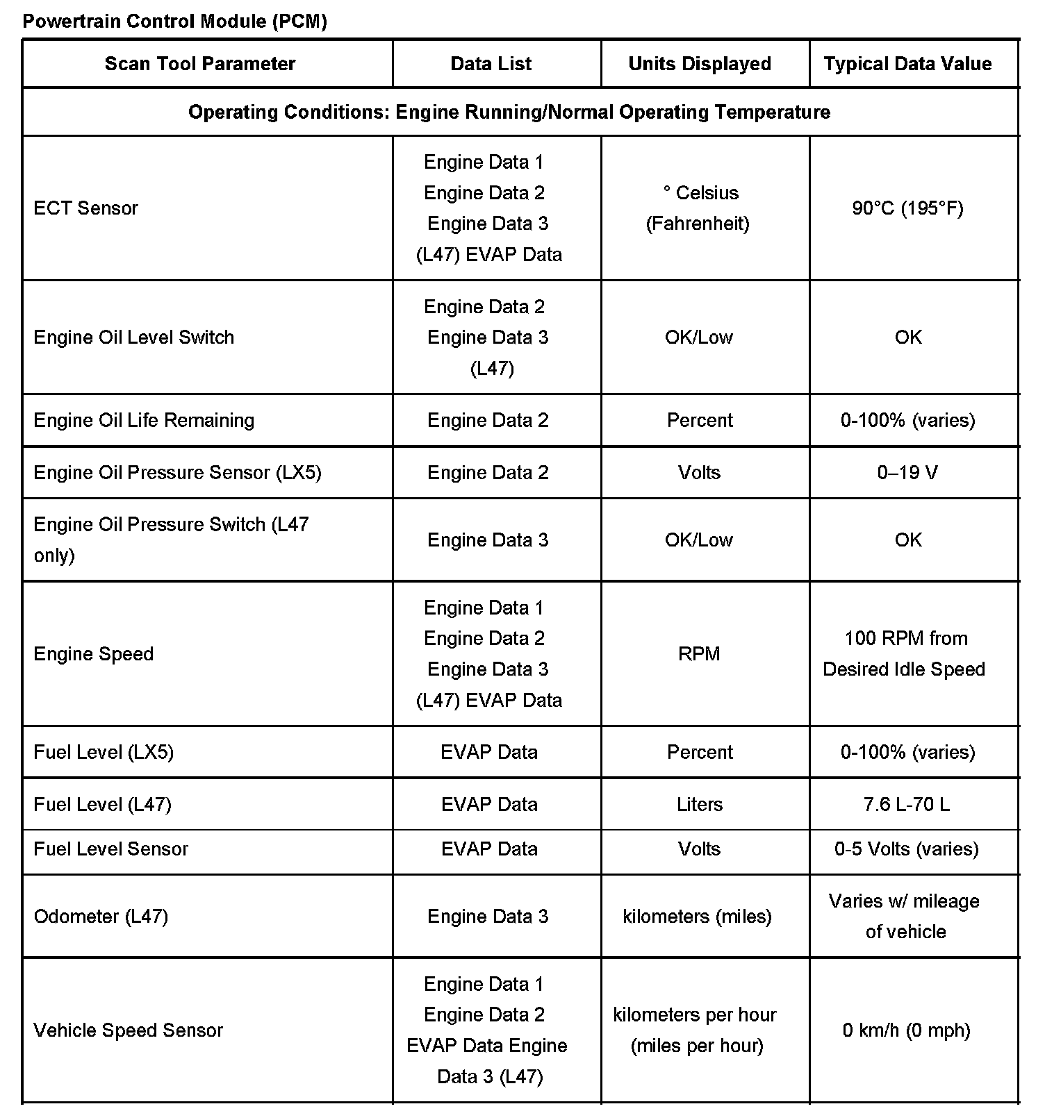 Powertrain Control Module (PCM) Scan Tool Data List: