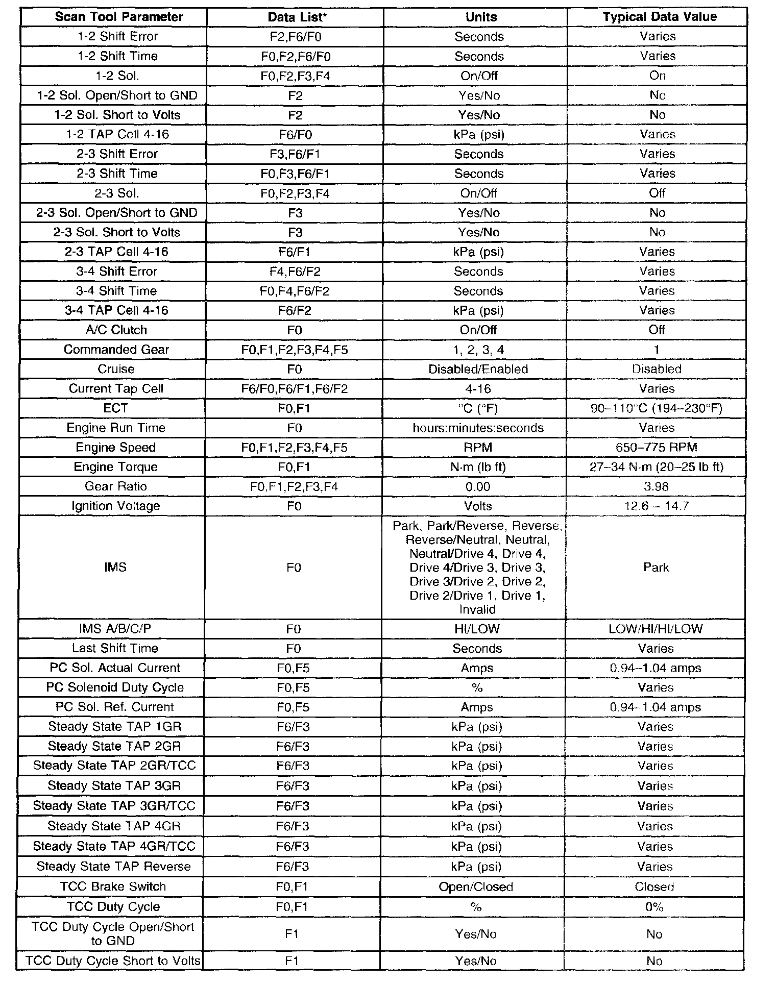 Only the parameters listed below are used in this manual for diagnosing. If a scan tool displays other parameters, the values are not recommended by General Motors for use in diagnosis.