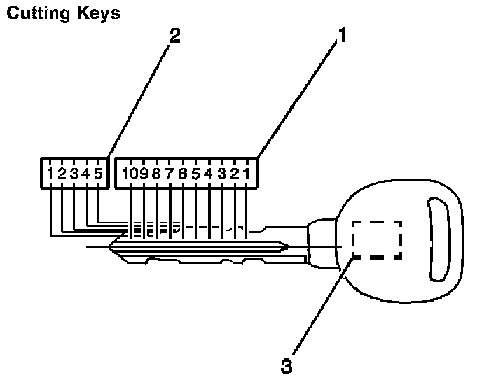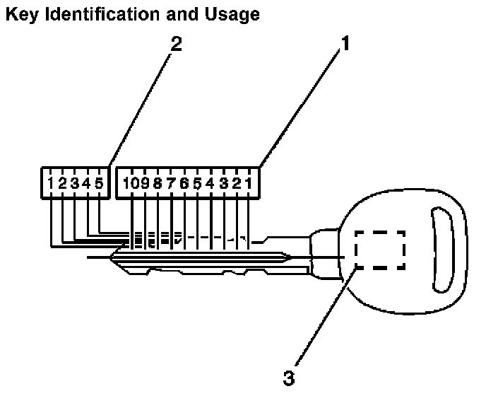 The key code can be obtained from the five-digit number on the key tag that accompanies the original master and valet keys. The five-digit key code cross references to the cut and tumbler sequence. The keys have 10 key cut positions (1) and five key cut depths (2). Key cut positions are numbered 1-10, counting from the head of the key to the tip. The key cut depths are 1-5, cut depth number 1 is the deepest cut. The key transponder (3) in the master and valet key must be programmed to the vehicle. Refer to Programming Theft Deterrent System Components.