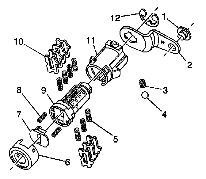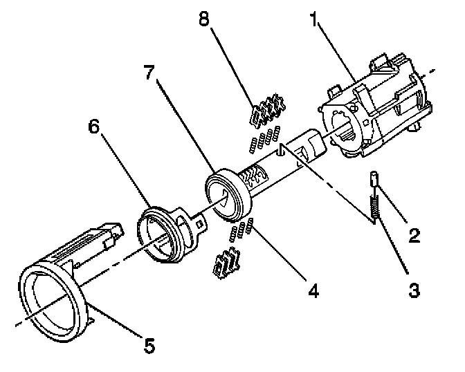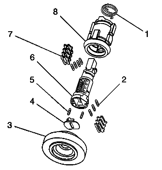 IMPORTANT: The ignition lock cylinder tumblers (8) are not self retaining and must be held in place if the key is not fully inserted into the lock cylinder.
