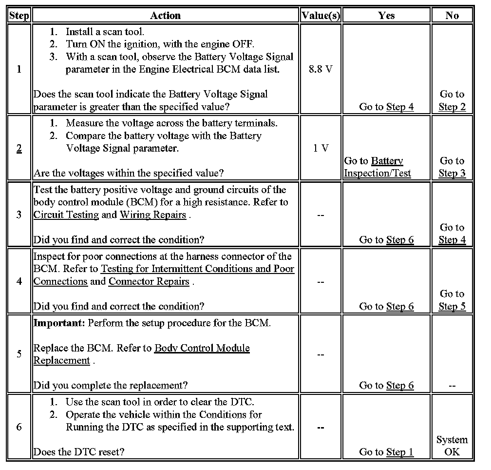 - This DTC shall be set as current when the voltage falls below 8.7 volts for 1,200 milliseconds.