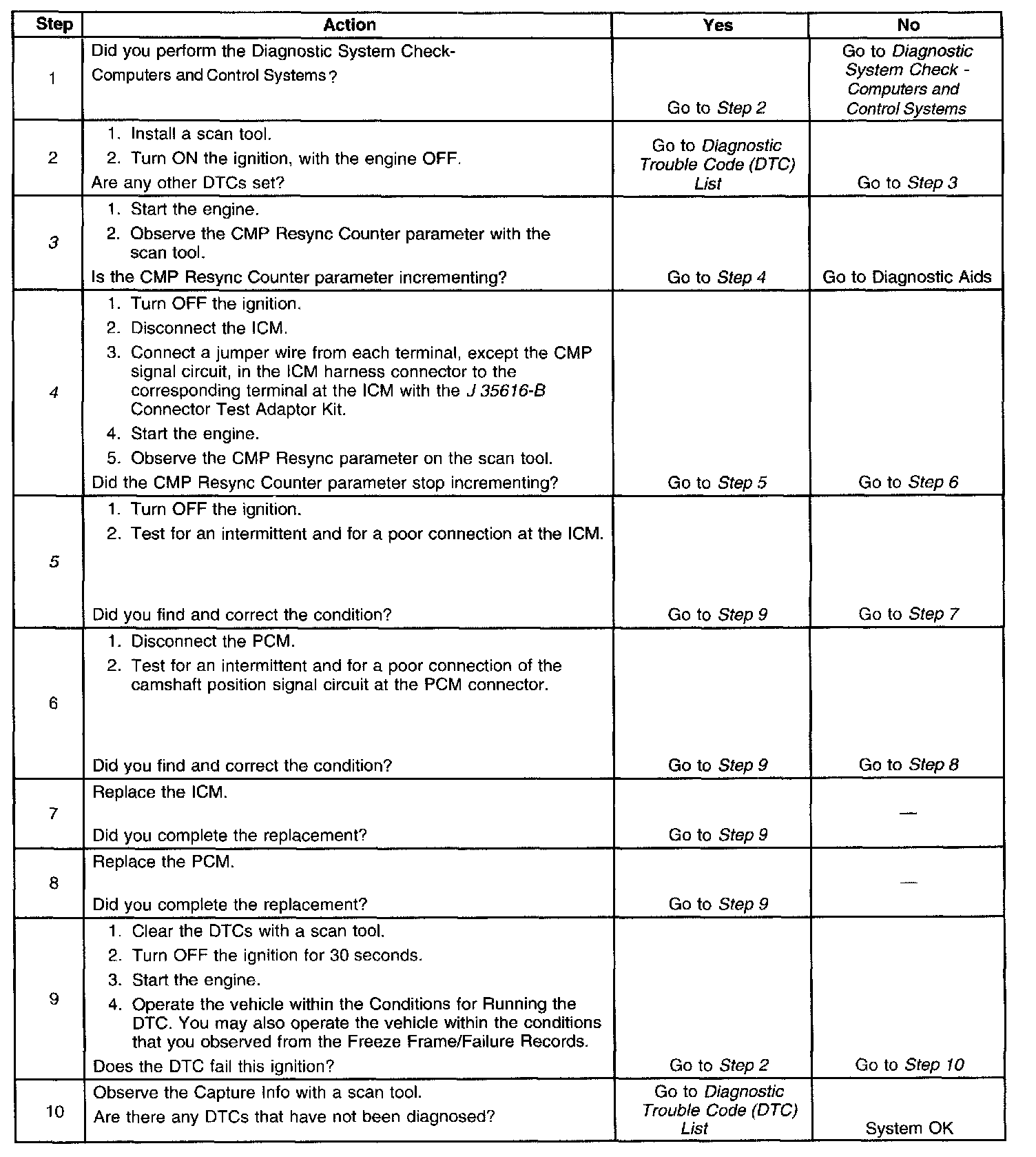 5. A faulty electrical connection in the camshaft position signal circuit can cause the CMP Resync Counter to increment. Anytime a faulty electrical connection is present, the CMP Reference Activity counter will stop incrementing.