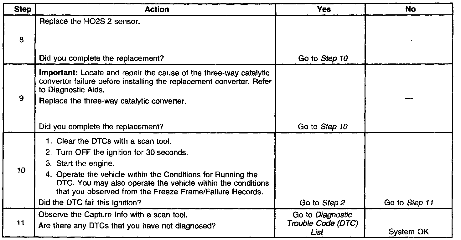 A three-way catalytic (TWC) converter controls exhaust emissions of hydrocarbons (HC), carbon monoxide (CO), and oxides of nitrogen (NOx). The catalyst within the converter promotes a chemical reaction which oxidizes the HC and the CO that is present in the exhaust gas. This process will convert the HC and the CO into water vapor and carbon dioxide (CO2), and will reduce the NOx, converting the NOx into nitrogen. The catalytic converter also stores oxygen. The powertrain control module (PCM) monitors this process by using a heated oxygen sensor (HO2S) which is in the exhaust stream past the three-way catalytic converter. The HO2S produces an output signal which indicates the oxygen storage capacity of the catalyst. This in turn indicates the catalysts ability to convert the exhaust emissions effectively. The PCM monitors the catalyst efficiency by first allowing the catalyst to heat, then waiting for a stabilization period while the engine is idling. Then, the PCM adds and removes fuel while monitoring the reaction of the HO2S. When the catalyst is functioning properly, the HO2S 2 response to the extra fuel is slow compared to the HO2S 1. When the HO2S 2 response is close to that of the HO2S 1, the oxygen storage capability or efficiency of the catalyst may be degraded below an acceptable threshold. If the PCM detects the degraded condition DTC P0420 sets.