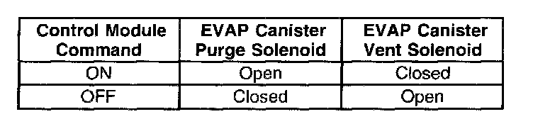 The table illustrates the relationship between the ON and OFF states, and the Open or Closed states of the EVAP canister purge and vent solenoid valves.