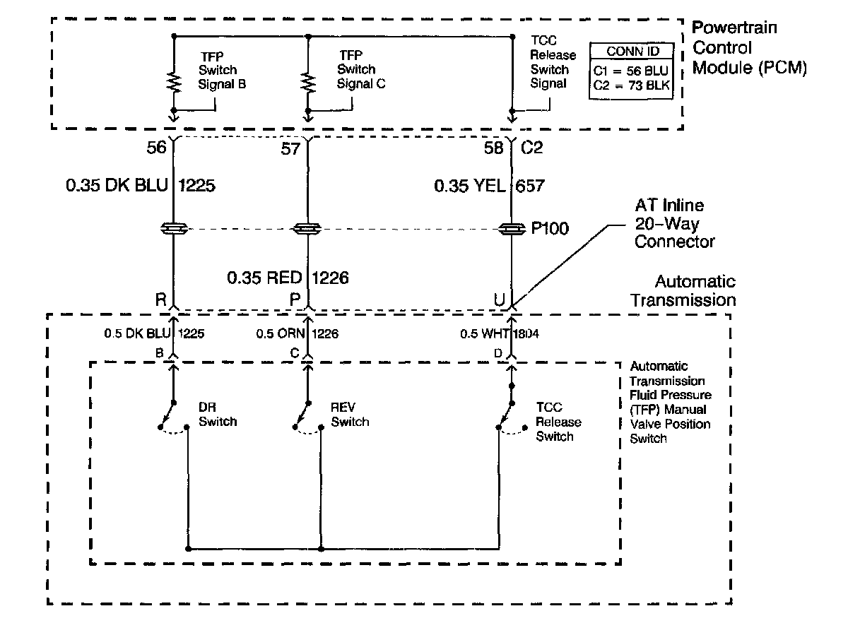 The automatic Transmission Fluid Pressure (TFP) manual valve position switch consists of three pressure switches. two of the switches are normally-open, and determine gear range selection. The third switch is normally-closed, and detects Torque Converter Clutch (TCC) release fluid pressure. The TFP manual valve position switch also contains the automatic Transmission Fluid Temperature (TFT)sensor. These components are combined into one unit, attached to the control valve body.