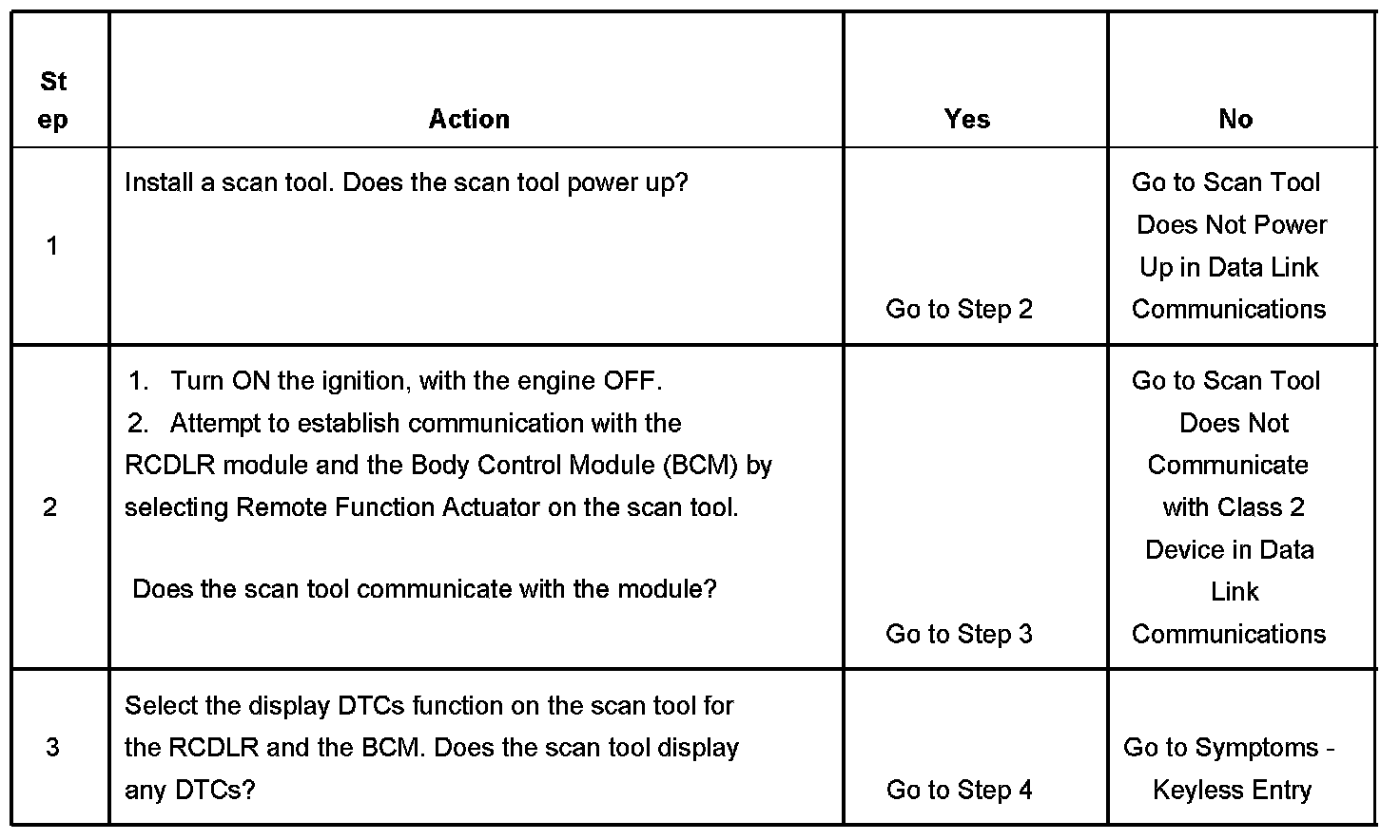 6. At this point you have determined all DTCs which could affect the keyless entry system. Refer to Symptoms - Keyless Entry for further keyless entry diagnosis. Any other codes displayed from the listed modules do not apply to the keyless entry system and should be diagnosed in the applicable section. Symptom Related Diagnostic Procedures