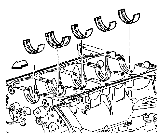 3. Install the lower bearing halves, without grooves, into the lower crankcase. Apply oil to bearing surfaces.