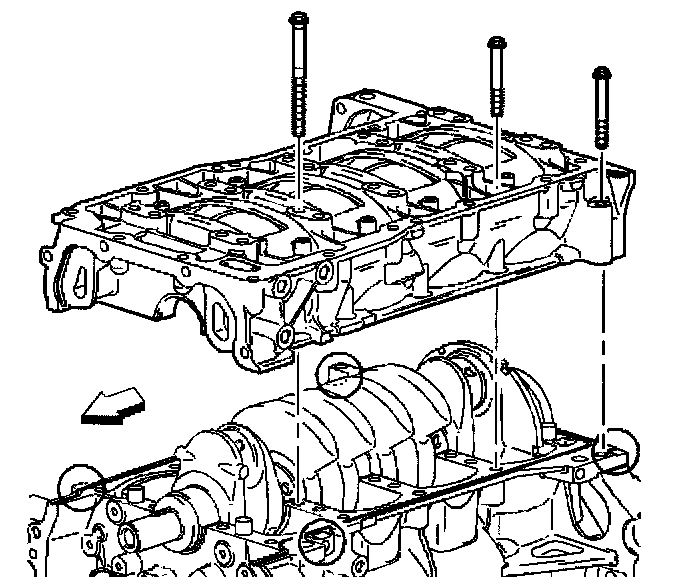 4. Apply sealer GM P/N 12346286 (Canadian P/N 10953472) to the surfaces of the engine block to bedplate mating surfaces.