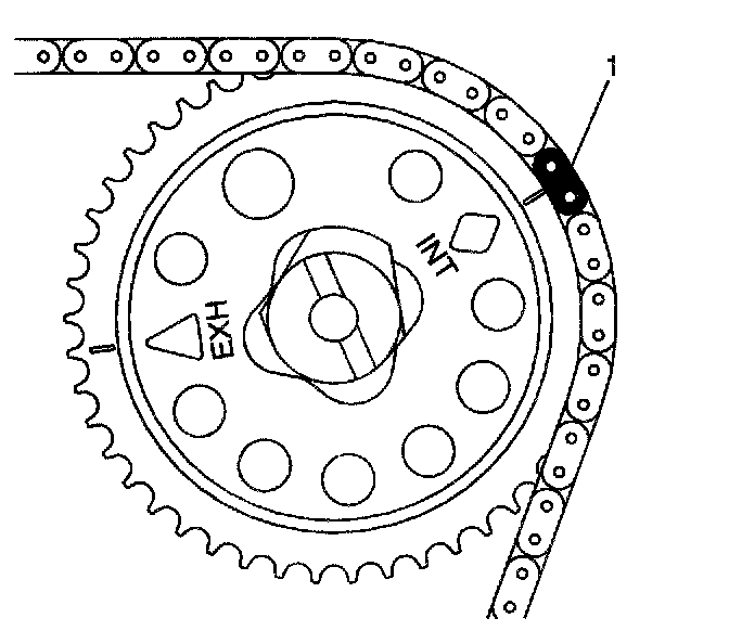 20. Route the timing chain around the intake camshaft sprocket with the uniquely colored link (1) aligning with the INT diamond.