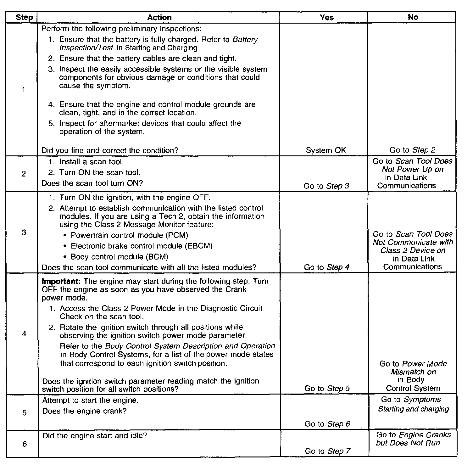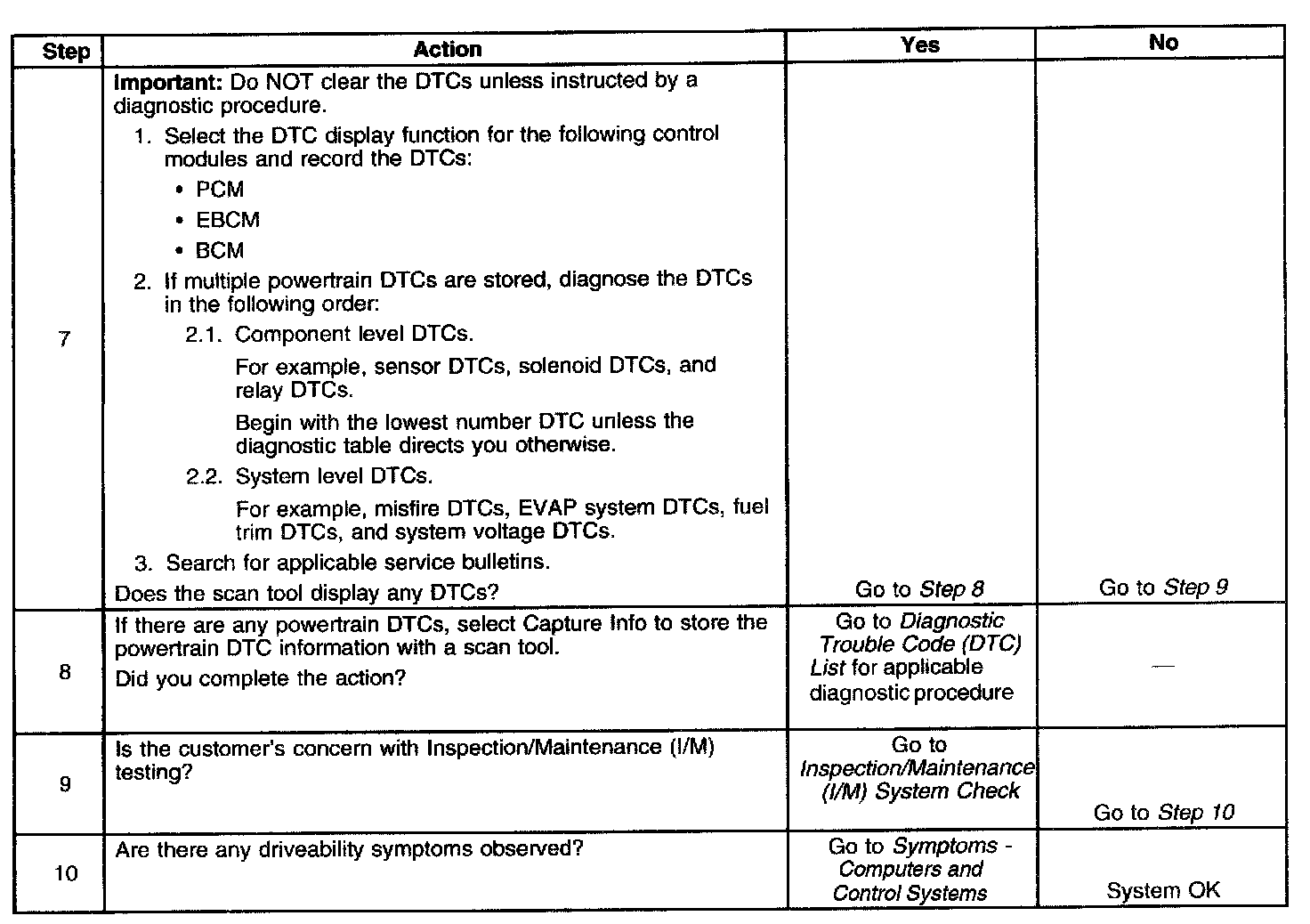 The Diagnostic System Check is an organized approach to identifying a condition created by an electronic engine control system malfunction. The Diagnostic System Check must be the starting point for any driveablity concern. The Diagnostic System Check directs the service technician to the next logical step in diagnosing the concern. Understanding the table and using the table correctly reduces diagnostic time and prevents the replacement of good parts.
