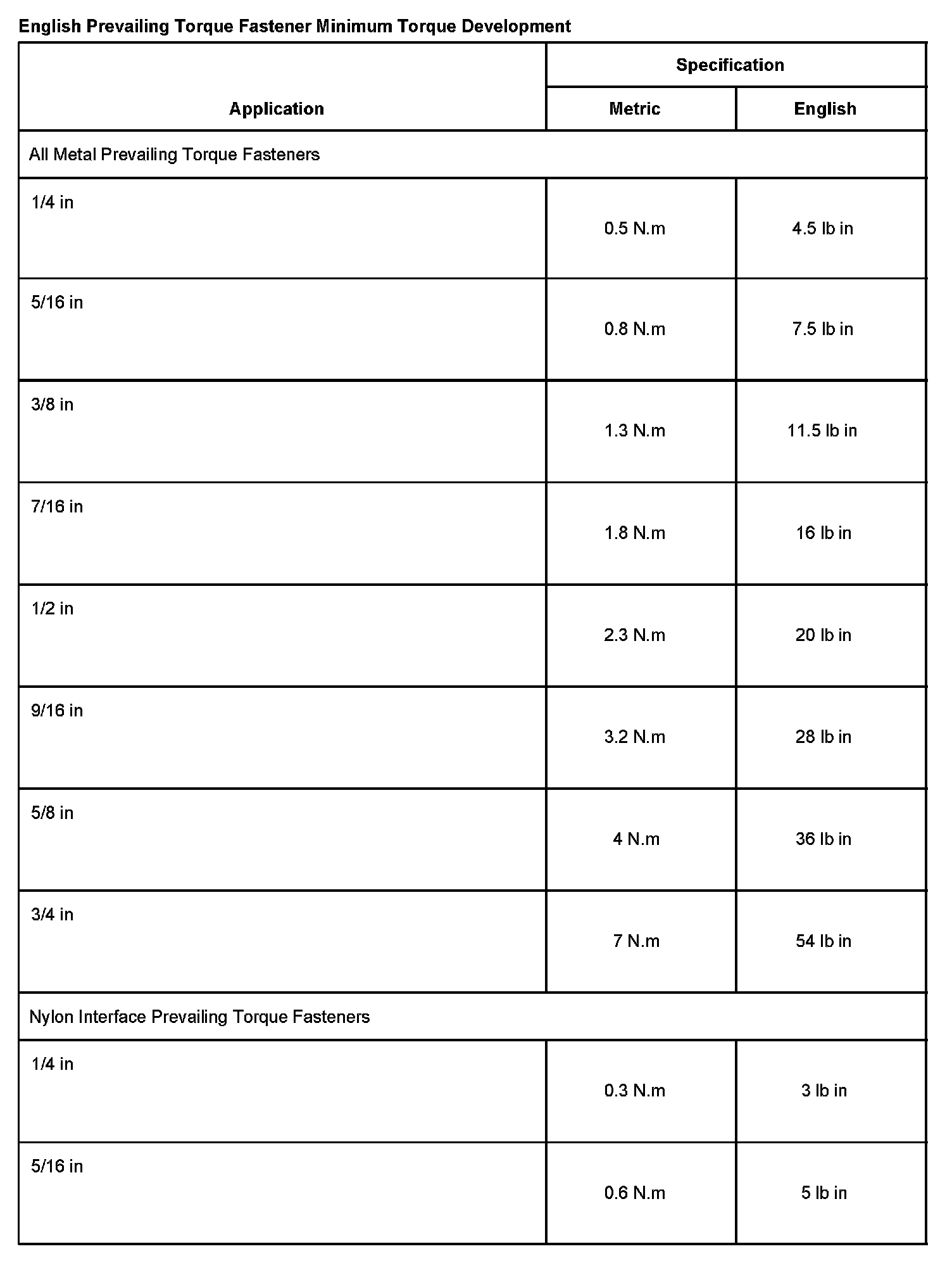 ENGLISH PREVAILING TORQUE FASTENER MINIMUM TORQUE DEVELOPMENT
