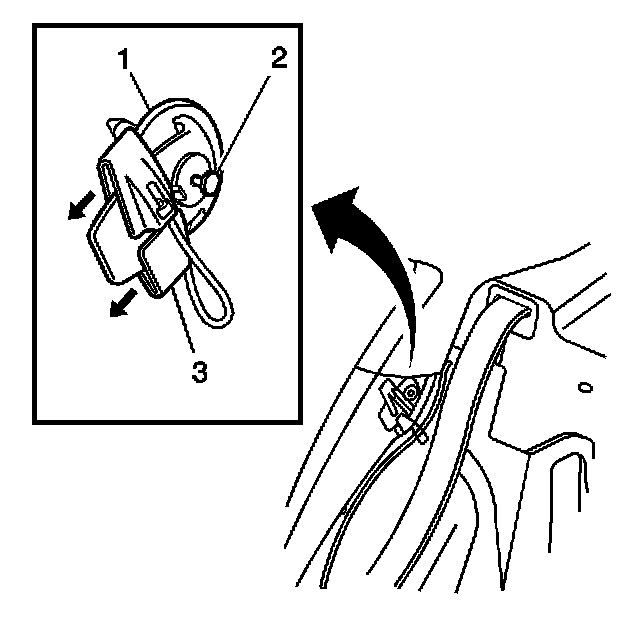 2. Disengage the push-pin retainer (2) from the child shoulder belt rerouter (1).