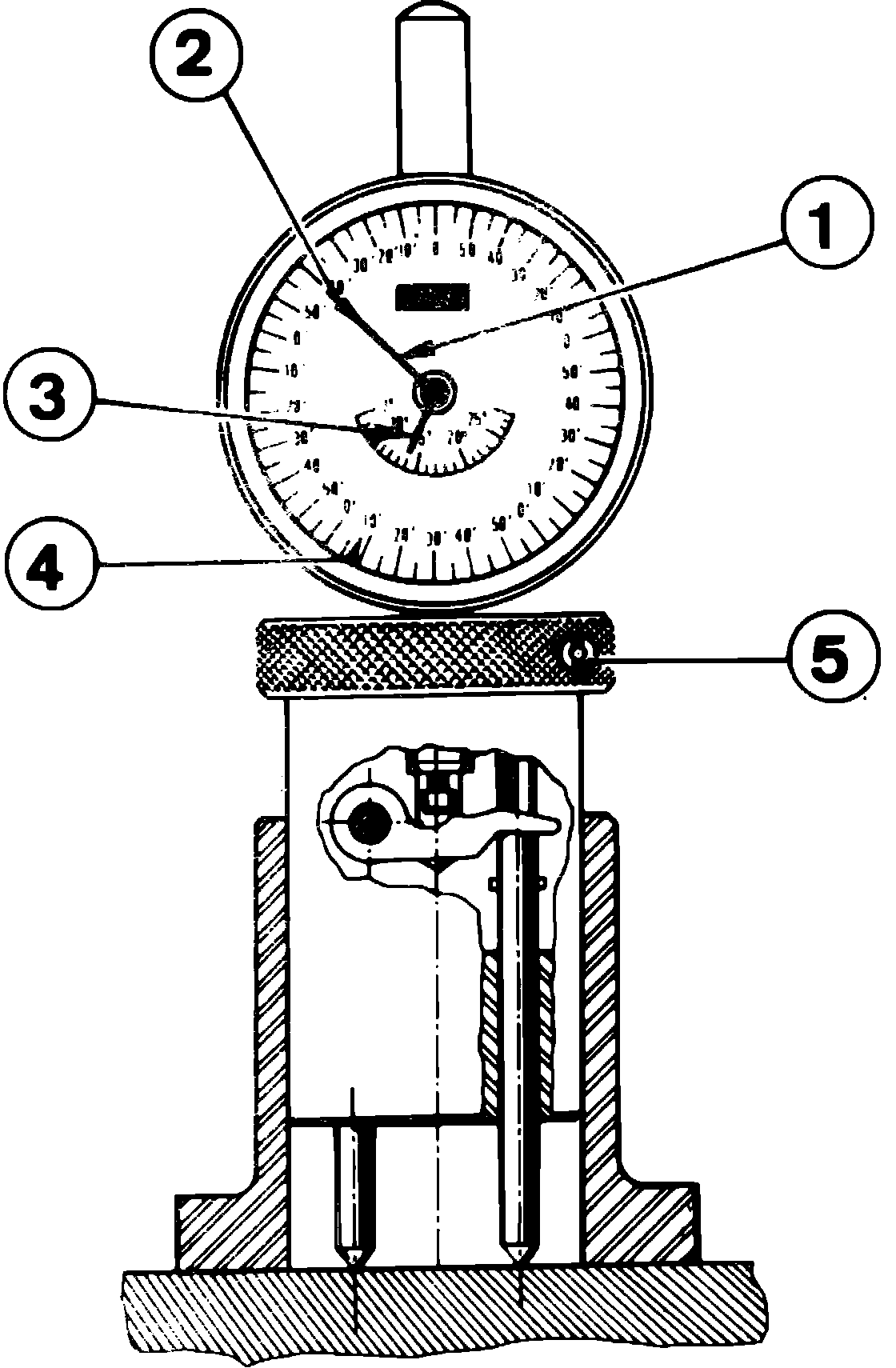 2. In this position, Fig. 4, needle (1) should be in front of red reference (2). Needle (3) should be in front of black reference. If necessary, set needles to correct position by loosening setscrew (5) to position tool accordingly.