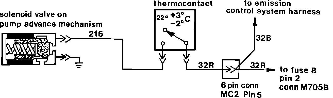 The 1984 Diesel injection pump differs from the earlier models in that it incorporates a cold start advance mechanism. A thermocontact located on the cylinder head will allow cold start advance until the coolant reaches 22~C + 3~ - 2~ or (71.6~F + 5.4~, - 3.6~ In the cooling off process, the cold start advance will not be authorized until the engine coolant temperature has dropped below 10~C + 3~, - 2~ or 50~F + 5.4~, - 3.6~.