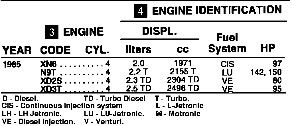 1984-81 - 6th character of VIN. All others - Prefix to engine number, stamped on engine block.